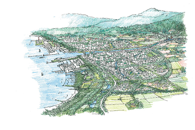 * A town in harmony with nature: Ecosystems are the foundation for the sustainability of cities. Town planning that makes the most of ecosystem functions leads to the creation of attractive towns. Networking greenery and developing green infrastructure provide multiple benefits such as enhanced disaster management and control, including flood mitigation, and improvement of the area’s living environment.